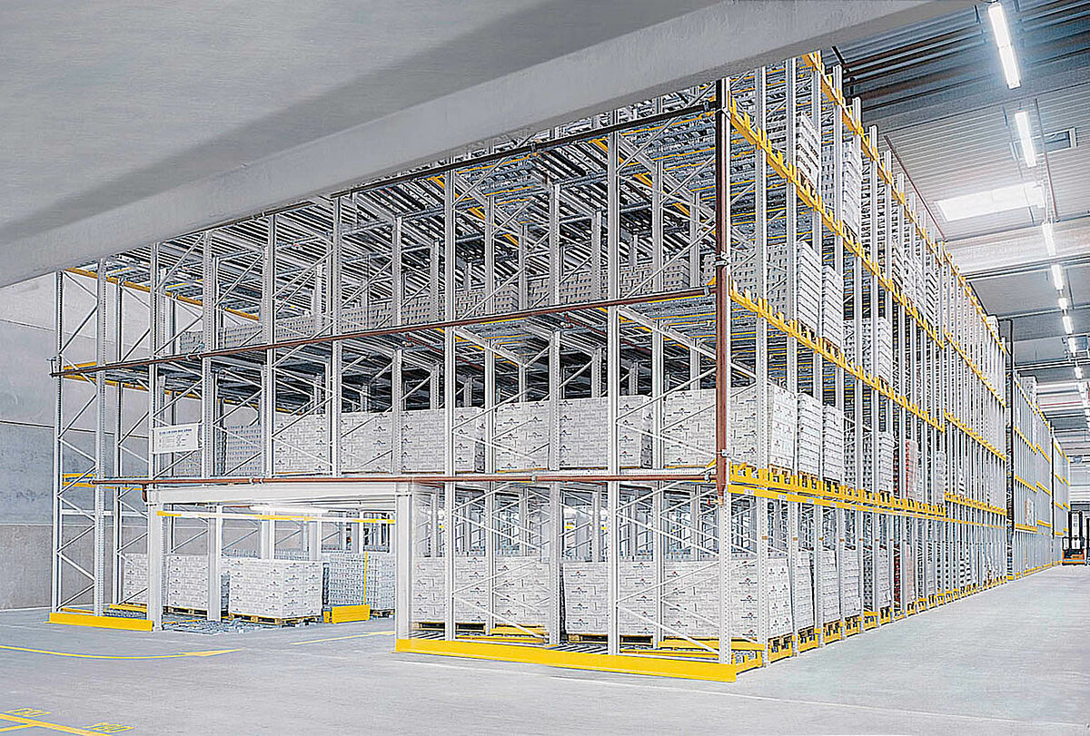 Das Paletten-Durchlaufregal ist eine der kompaktesten Methoden zum Lagern und Kommissionieren nach dem First-in-First-out-Prinzip. Durch die Kanalbildung wird mit dem Regalsystem eine hohe Flächennutzung erzeugt, sowie bei einheitlichen Paletten ein optimaler Füllgrad erreicht. Durch das leichtgängige Rollensystem mit integrierten Bremstragrollen rückt die Ware durch das Eigengewicht zur Entnahmeposition nach. Die Palettenvereinzelung auf der Entnahmeseite sorgt für ein sicheres Handling.
