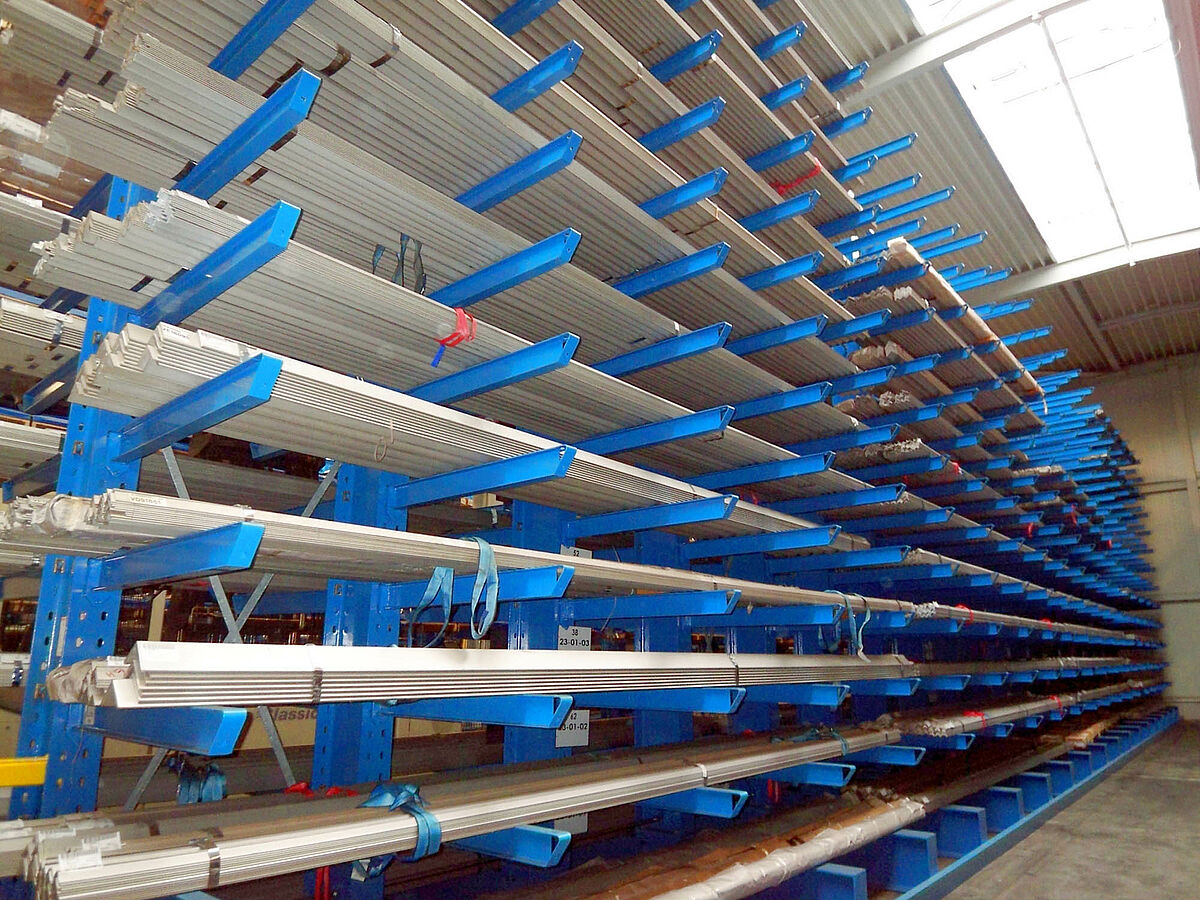 Die Lösung war ein Kragarmregal-System mit einer Höhe von 7,50 m und 14 Lagerebenen übereinander bei einer Tragfähigkeit von jeweils 1.200 kg pro Kragarm mit einer Länge von 1.250 mm.